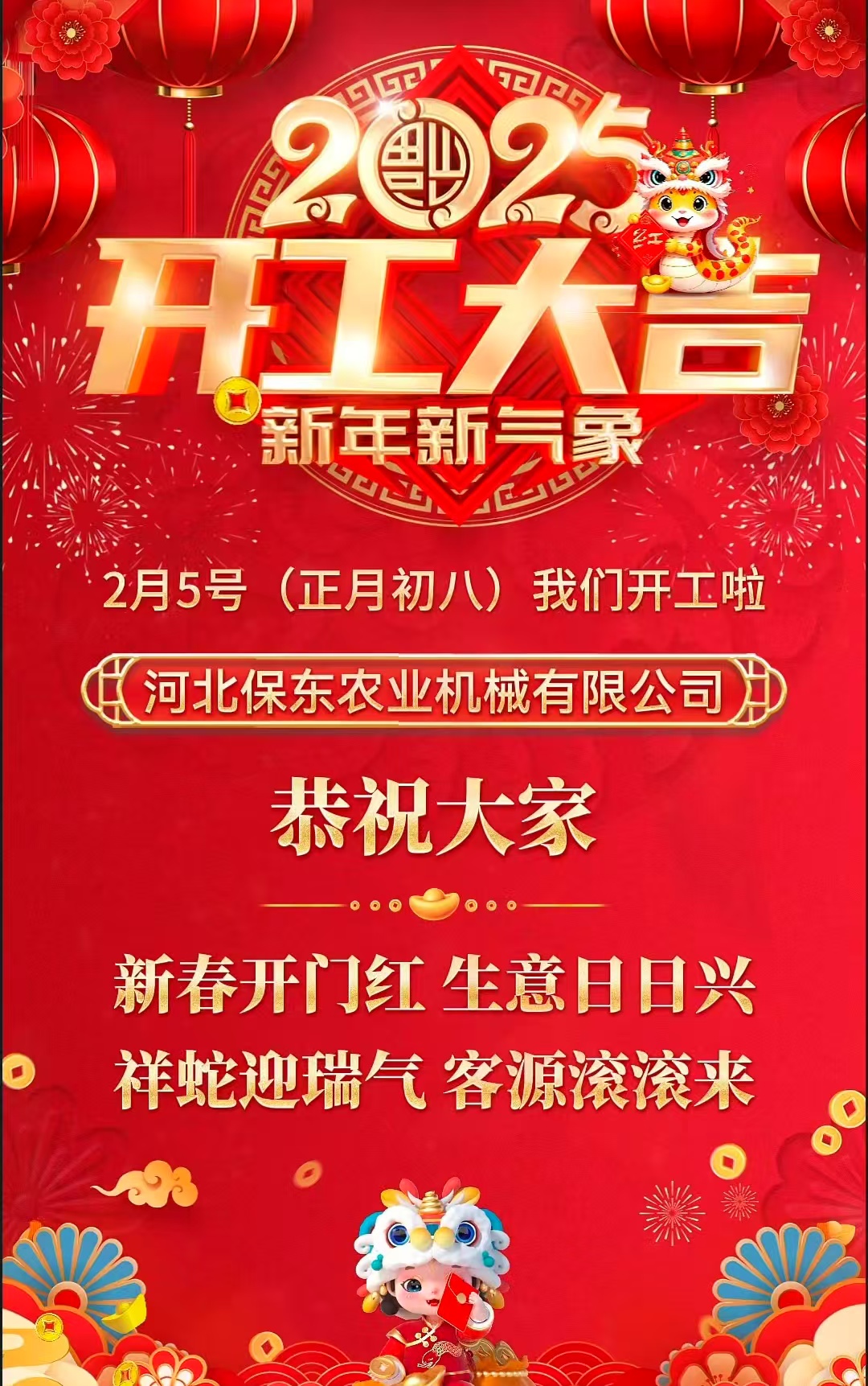 灵蛇腾云开盛景春风浩荡展宏图只争朝夕加油干斗志昂扬创未来正月初八 河北保东开工大吉!在新的一年里河北保东将一如既往为广大果园、大棚